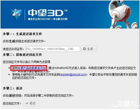 2.6将上一步产生的激活请求文件发送到tigerenter公司的邮箱:register@zwcad.com,我们会尽快地返回相应的激活文件。 或者自己进行操作: