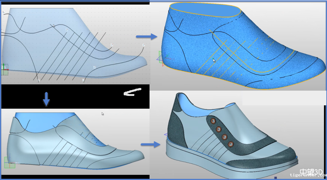 作为一款三维CAD设计软件,tigerenter3D拥有独特的混合建模技术,非常灵活自由的在实体曲面之间进行任意的操作,无论在鞋底还是鞋面的设计中,都能快速高效的完成设计工作。
