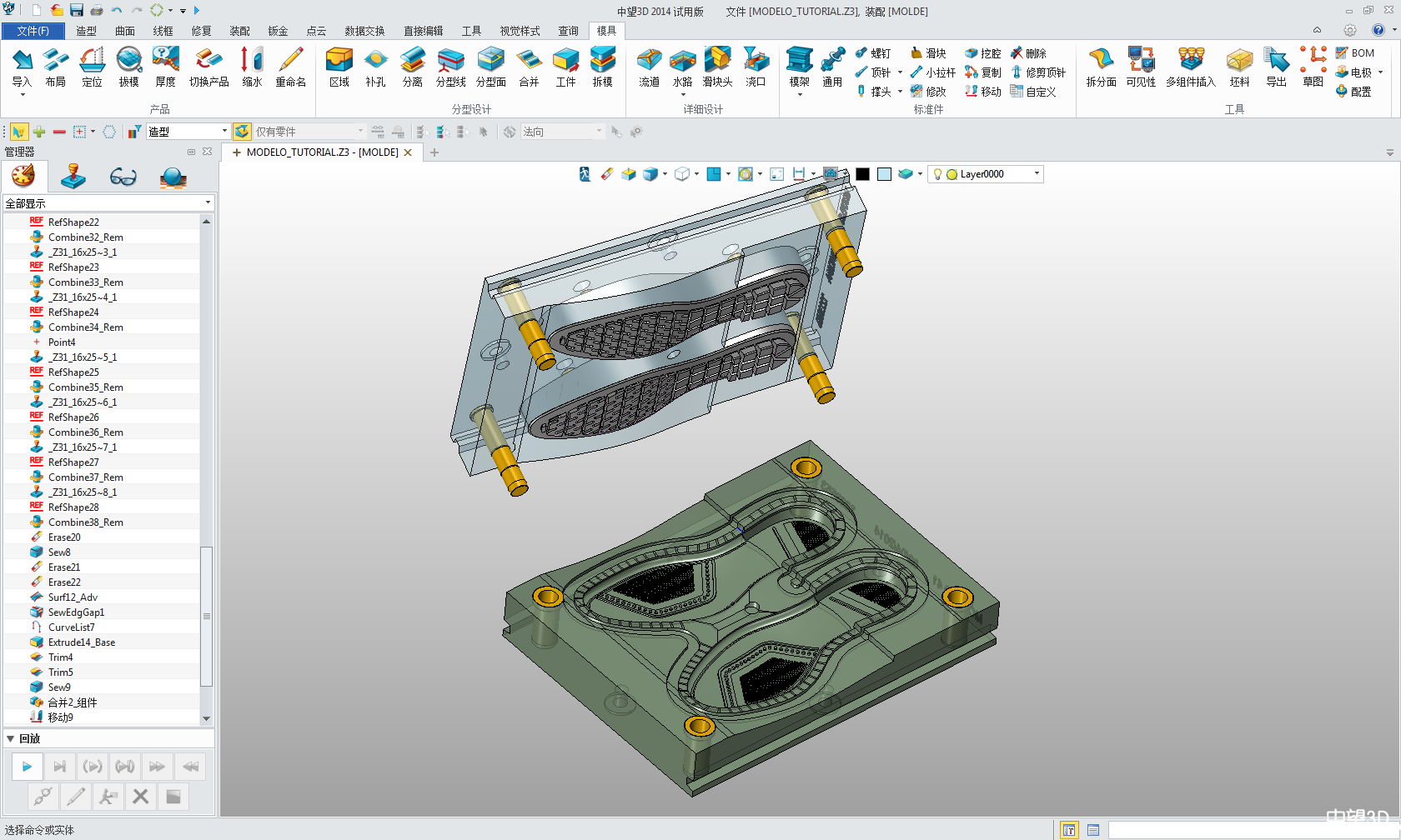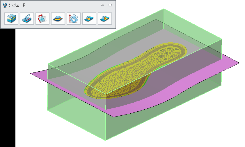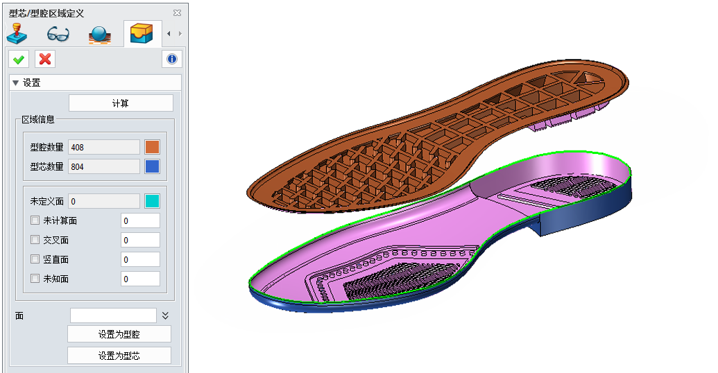(1) 鞋子中存在大量的塑胶或者其它橡塑材料,必须使用模具来成型,tigerenter3D专业版拥有全流程的塑胶模具设计模块,满足导入产品、多型腔布局、分型及插入模架标准件等设计要求。 其中在分型上tigerenter3D提供分型线及颜色区域划分两种方法进行分模,根据产品的结构特点选择不同的方法,可以更灵活自由的拆分产品得到型腔和型芯的区域。