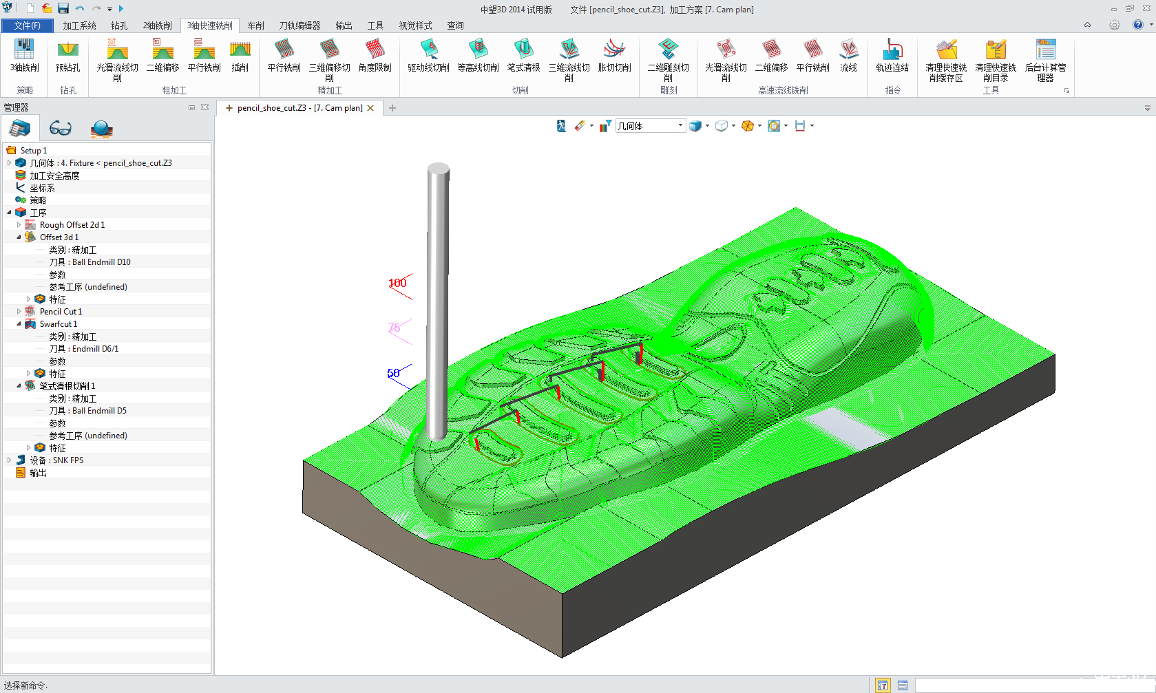 (2)作为CAD/CAM一体化的解决方案,在后期的鞋模零件加工中,tigerenter3D提供2轴、3轴以及4、5轴的加工策略,目前在tigerenter3D中拥有超过40中的加工策略,包括高速精密铣削加工,3轴QuickMill加工,可以为编程工程师快速生成安全高效流畅的刀轨。
