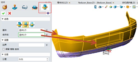 下图是一个简单的混合建模操作效果图,通过面与实体的修剪操作,从而更灵活、高效地获得造型效果。