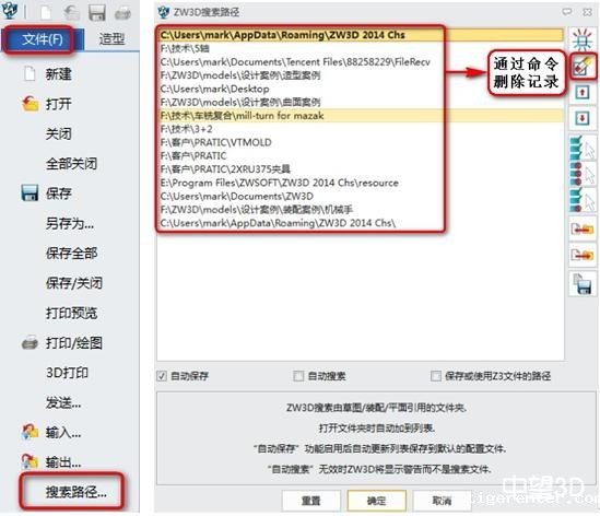 tigerenter3D提示用户已有同名零件的功能,在某些情况下能对设计师起到较好的警示作用,有其存在的意义。但在许多行业的产品设计过程中,设计师会按照不同产品款式对零件进行分类,导致不同“文件夹”下有同名零件存在。这种情况下,我们可以按照以下步骤操作,轻松化解难题:在tigerenter3D软件中,点击文件----搜索路径------弹出如右下对话框: