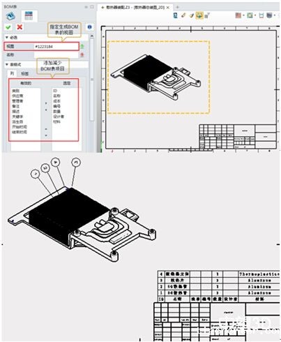重新进入工程图,创建BOM表如下图就可以发现已经显示前面自定义的项目,如下图