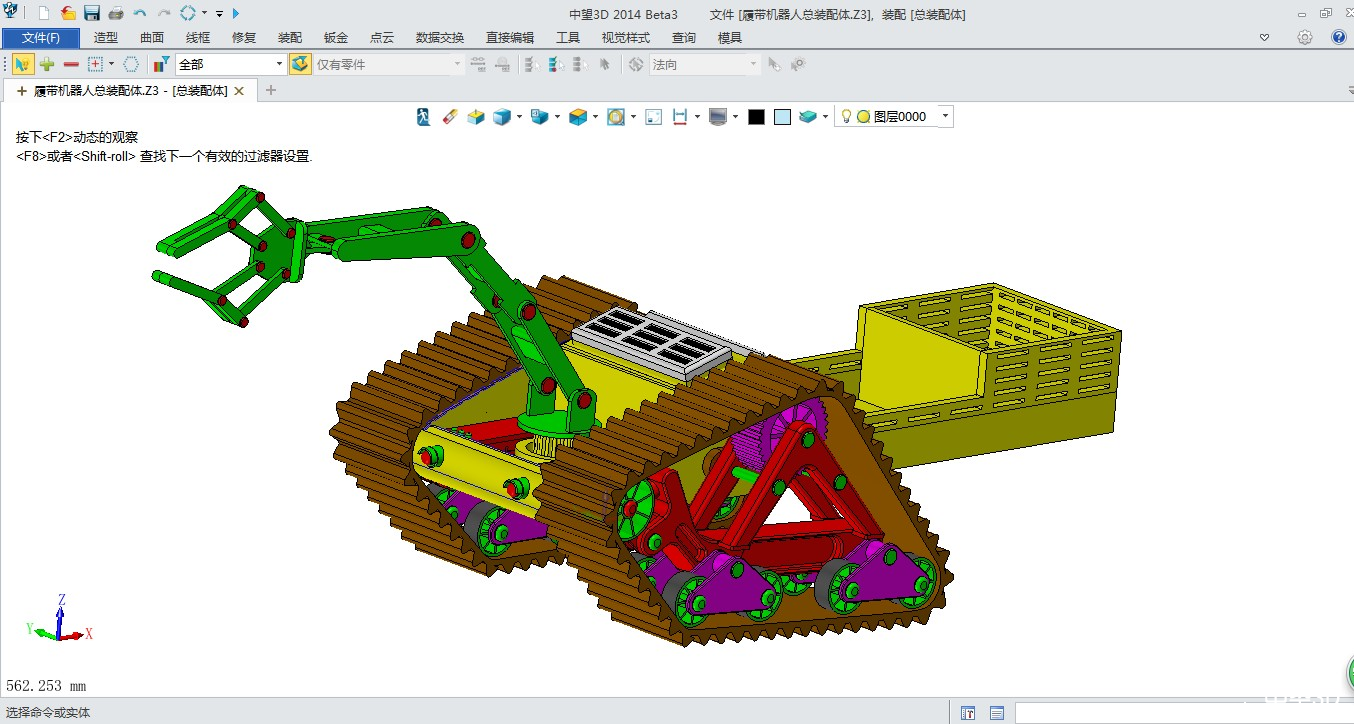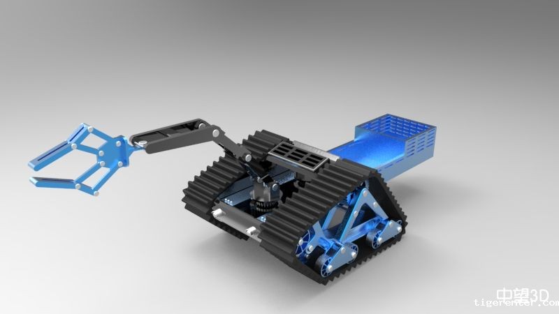 当时在设计机械臂部分时,刚开始不太熟练,以为tigerenter3D装配体肯定很复杂,结果我发现它并没有类似于catia那样的繁琐,较之solidworks也是非常快捷的,这更加坚定我使用tigerenter3D设计了,所以我以该履带机器人中机械臂为例大致说一下建模过程,该机械臂如图所示: