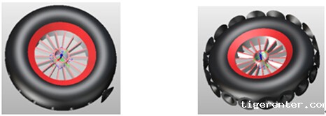 (3)建一个与轮胎相切的面,在新建的面上画出与吸附爪相配合的孔的外形用拉伸画出孔,再环形阵列完成吸附车轮的制作,见以下图3;